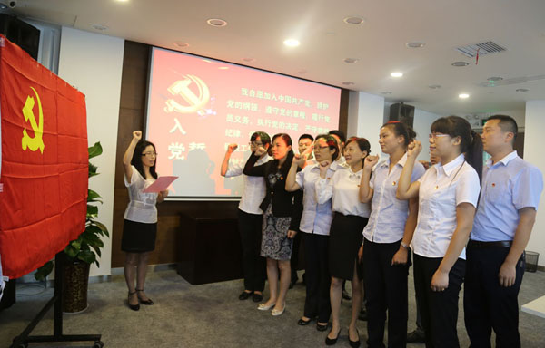 ??????? 仪式开始后,在公司党委办公室负责人杨玉英的带领下,来自总部及成员单位的13名新党员面向鲜红的党旗, 右手握拳庄严宣誓,表达为共产主义事业奋斗终生的决心。